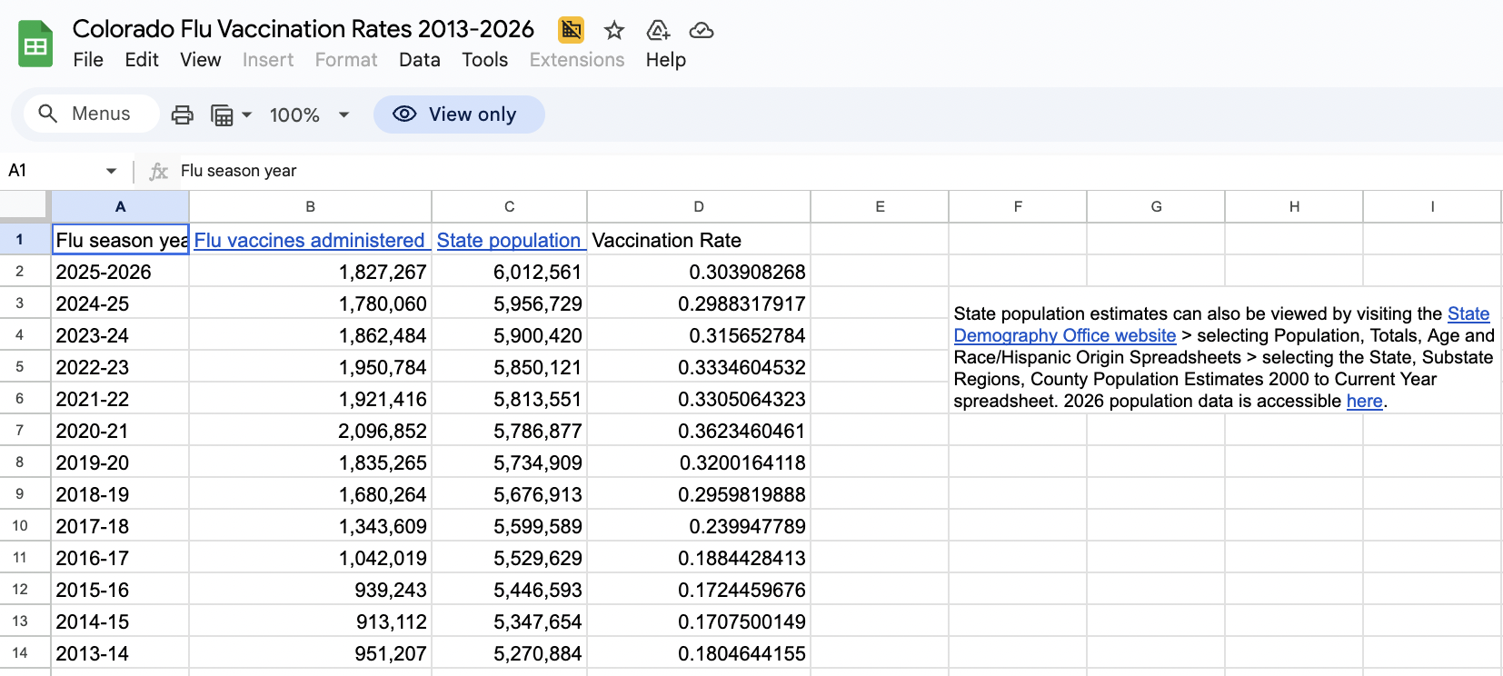 As of Feb. 4, just over 1.8 million Coloradans have gotten their flu shot, state public health data shows. That’s roughly a 30.4% vaccination rate, based on state population data, up from 29.9% during the same period last year, a Colorado Sun analysis shows. Before this year’s flu season, flu vaccination rates had been steadily declining since peaking in 2020 at 36.2%.Despite the uptick this season, the total number of immunizations administered is still lower than it was between 2020 and 2023, which saw between 1.8 million and 1.9 million vaccinations as of Feb. 4 of each year.The midseason vaccination rate hit its lowest point since 2013 during the 2014-2015 season, at 17.1%.