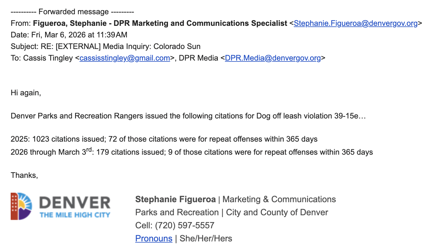First-time leash law offenders can receive an $80 ticket, which increases to $150 after the second violation and $300 thereafter. Denver Parks and Recreation issued 1,023 tickets for leash law violations in 2025, including 72 for repeat offenses.